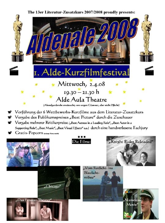 Die Ergebnisse konnten sich sehen lassen und vermittelten nach dem Frühjahrskonzert Musik am Alde einen weiteren positiven Eindruck von der musischen Ausbildung an dieser Schule. Eröffnet wurde die Aldenale mit dem Film Vom Rotlicht- ins Blaulichtmilieu, eine filmische Umsetzung einer Satire von Wiglaf Droste, bei der besonders der von Simeon Jesse verkörperte Zuhälter Szenenapplaus bekam. Es folgte mit Das Fenstertheater eine Verfilmung des gleichnamigen Kurzgeschichten-Klassikers von Ilse Aichinger – Film pur, da er völlig ohne gesprochene Worte auskam und vor allem schauspielerisch überzeugte. Max Schürenberg erhielt hier für seine Leistung den Preis als bester Hauptdarsteller. Eine beeindruckende Bebilderung des Erfolgssongs Chicago von Clueso stellte der darauffolgende gleichnamige Film dar; den Preis für die beste Hauptdarstellerin erhielt hierfür Annemarie Kolnsberg.