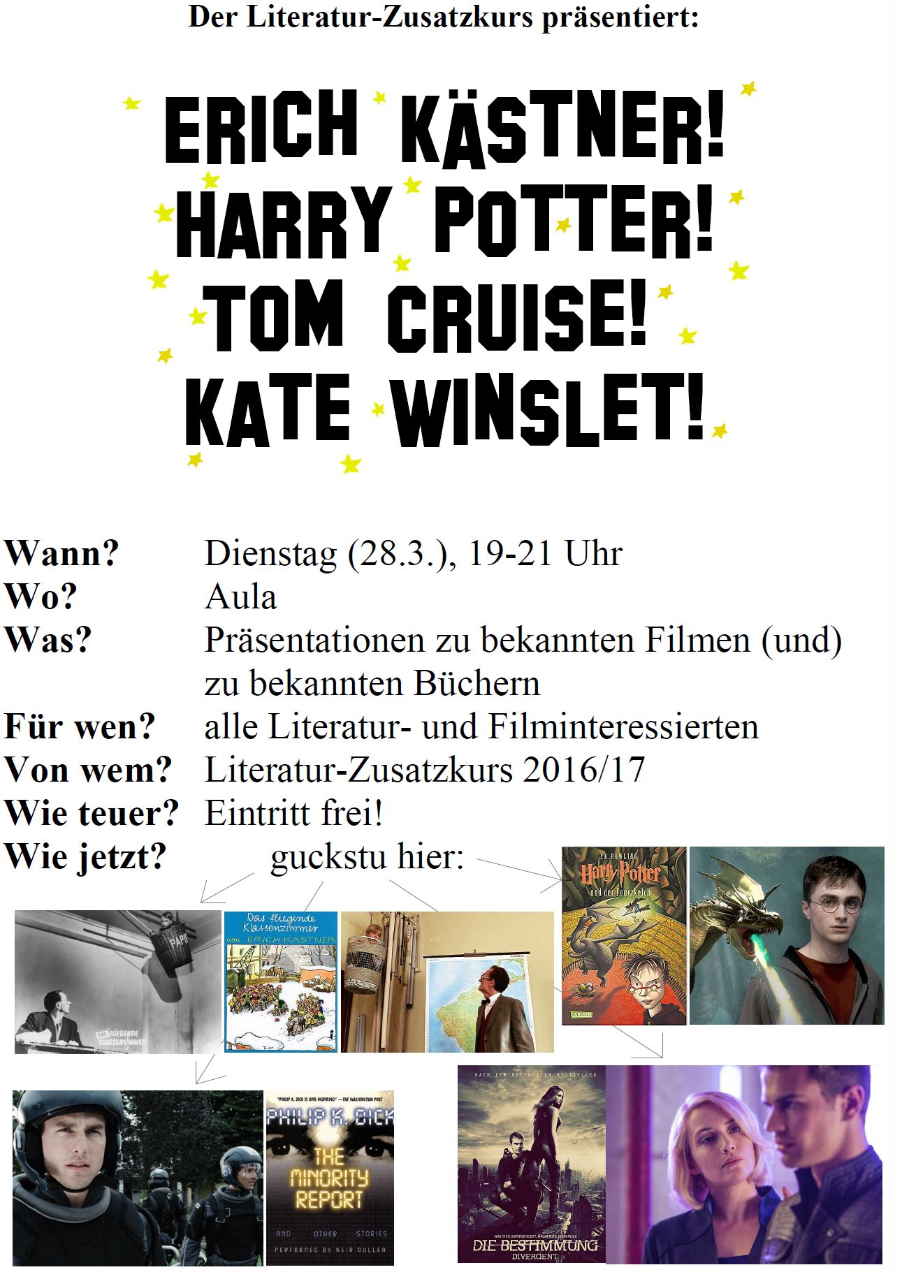 Auch dieses Jahr stellte der Literaturkurs der Q2 des Aldegrever-Gymnasiums, begleitet von Wolfgang Zschocke, wieder eine Projektarbeit vor. Bei der Präsentation für die Schulöffentlichkeit am 28.3.2017 ging es um das breite Themenfeld der Verfilmungen von Büchern oder Kurzgeschichten und darum, wie diese von 1954 bis 2014 umgesetzt wurden. Vorausgegangen waren im Unterricht das Schreiben und Rezensieren eigener Kurzgeschichten, Übungen zur Filmanalyse – z. B. anhand eines Monty-Python-Sketches und einer Folge der Serie »House of Cards« – und die Untersuchung von filmischen Umsetzungen von Büchern wie »Der Pianist« und »Das Parfum«.