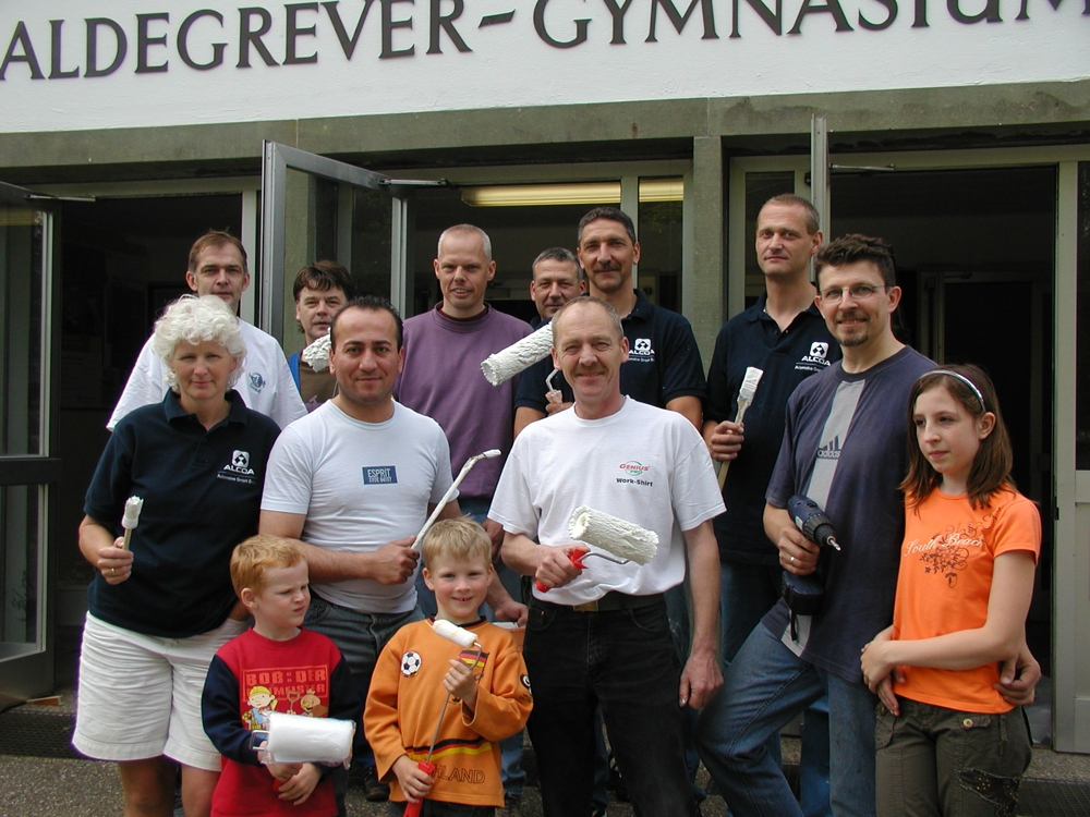 Alcoa-Mitarbeiter Andreas Bonk ist Vater eines »Aldgrever-Kindes« und hat den Einsatz vom Samstag organisiert. Im Werk musste er Mitstreiter für die Zusatzarbeit am freien Samstag suchen. Das klappte gut. »Denn für die Kinder sollte man etwas machen«, begründet Bonk das Freizeit-Engagement. Zu denen, die mit Quast und Pinsel hantieren, gehören auch frühere Alde-Schüler. »Dass Ehemalige ihre alte Schule streichen, ist doch etwas Besonderes«, schmunzelt Andreas Bonk, trinkt den Pausenkaffee aus und gibt das Signal zum Weitermachen. Es gibt viel zu tun.